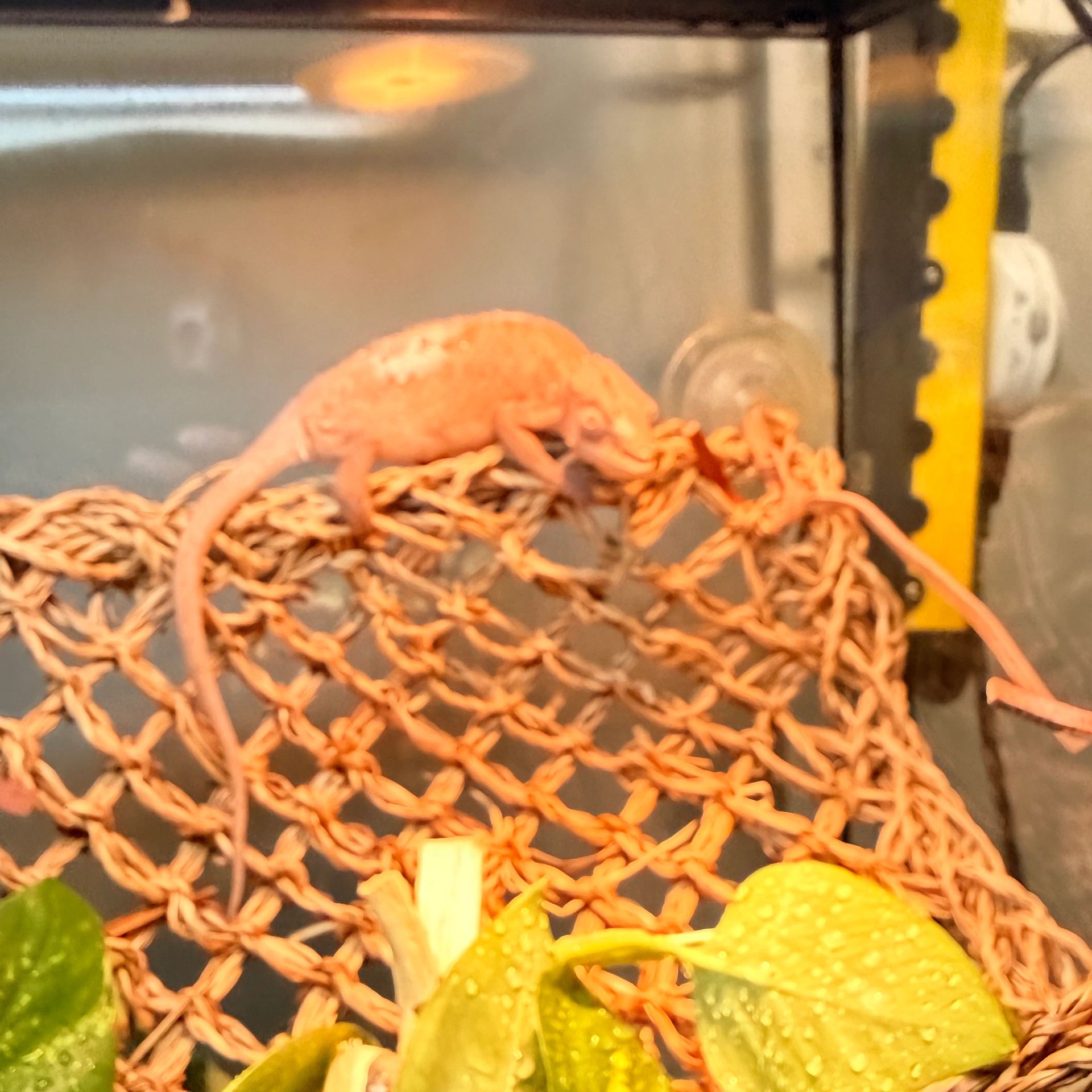 Please excuse this young lady's shed and stand off attitude. She is a unique colored Panther Chameleon. She eats very well and stays active. Still a bit sassy on being held, but she is coming around.