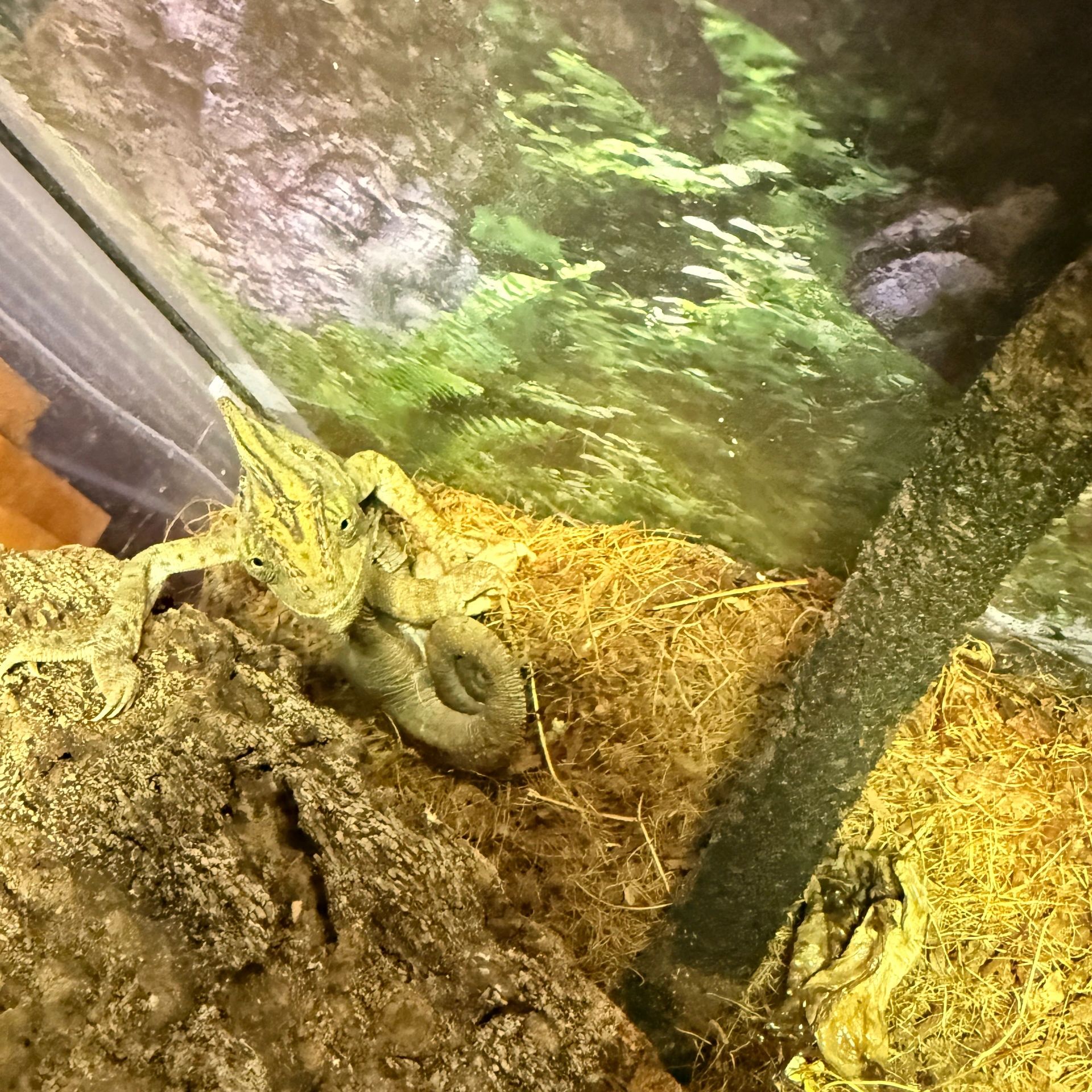 "Frankie" is a female Veiled Chameleon looking for her new forever home. As you can see she is sassy and demanding of her subjects. She is active in the morning and loves to hang out in her live plant. Sometimes like in this photo she hides behind her cork.