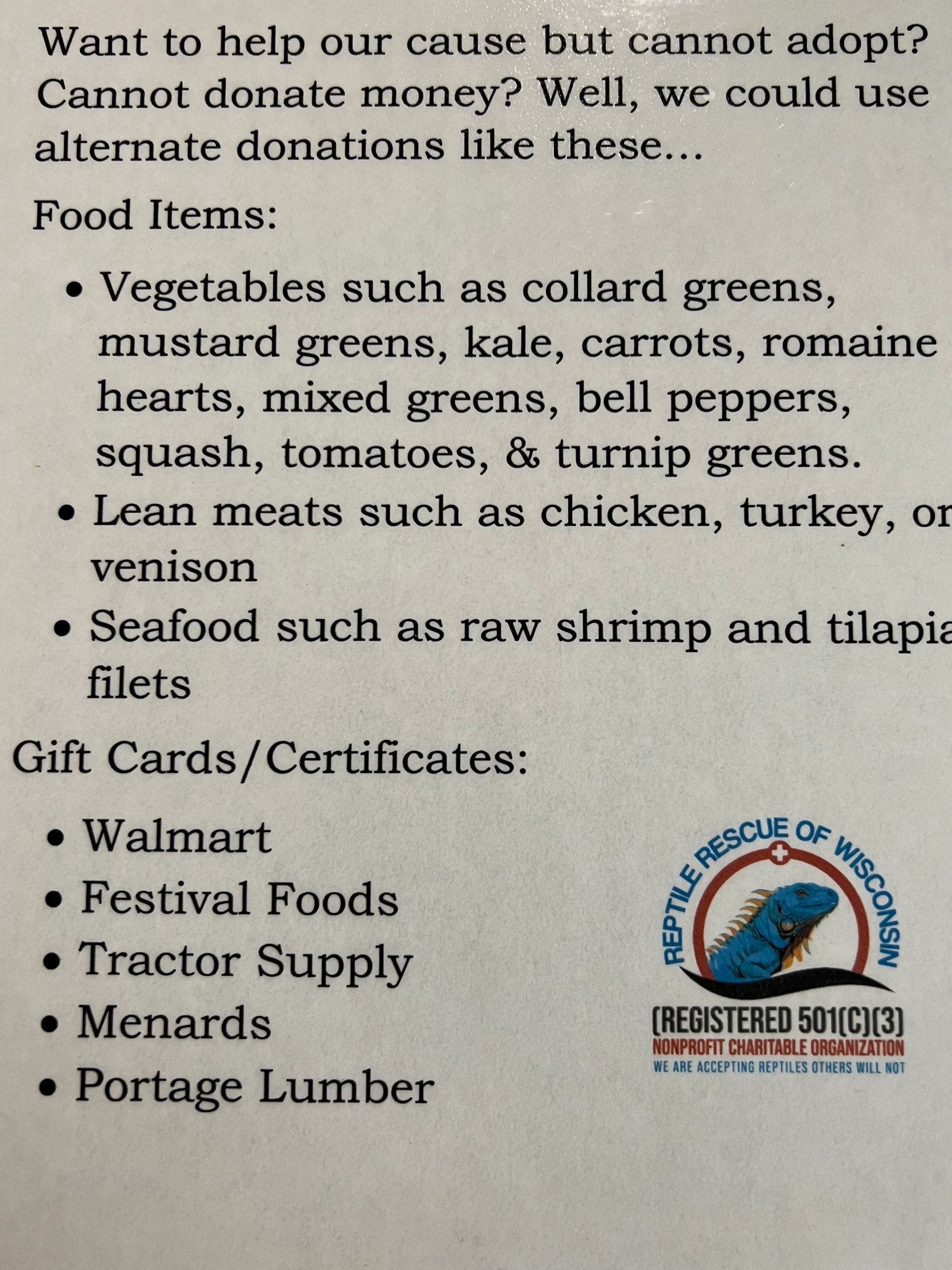 All donations to Reptile Rescue of Wisconsin, Inc. are deuctible to the donor in compliance with the provisions of IRC 501(a) or other applicable section of the IRC. EIN: 85-1606943